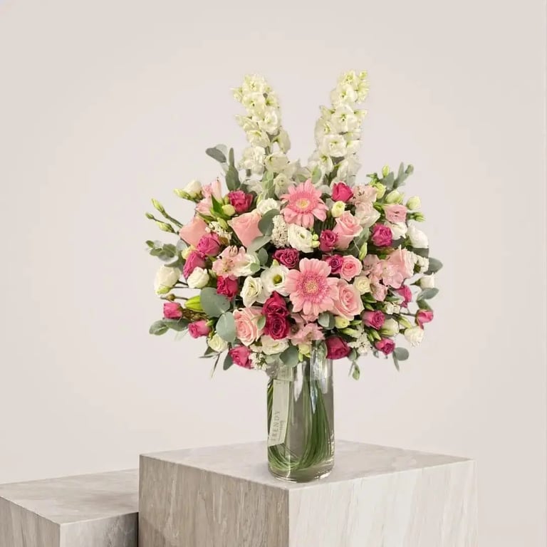 تميز بإهداء يليق بالأناقة والرقي مع فازة الورد الطبيعي الفاخرة بتنسيق رائع يضم البيبي روز والدولفينيوم والجريبيرا بتكامل مع الأكسسوارات الهولندية الفاخرة.