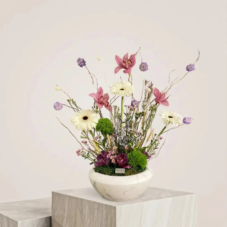 إليك الحل الأمثل: فازة ورد طبيعي بتنسيق مبتكر من زهور السيمبوديوم و الجربيرا من متجر ترندي روز!