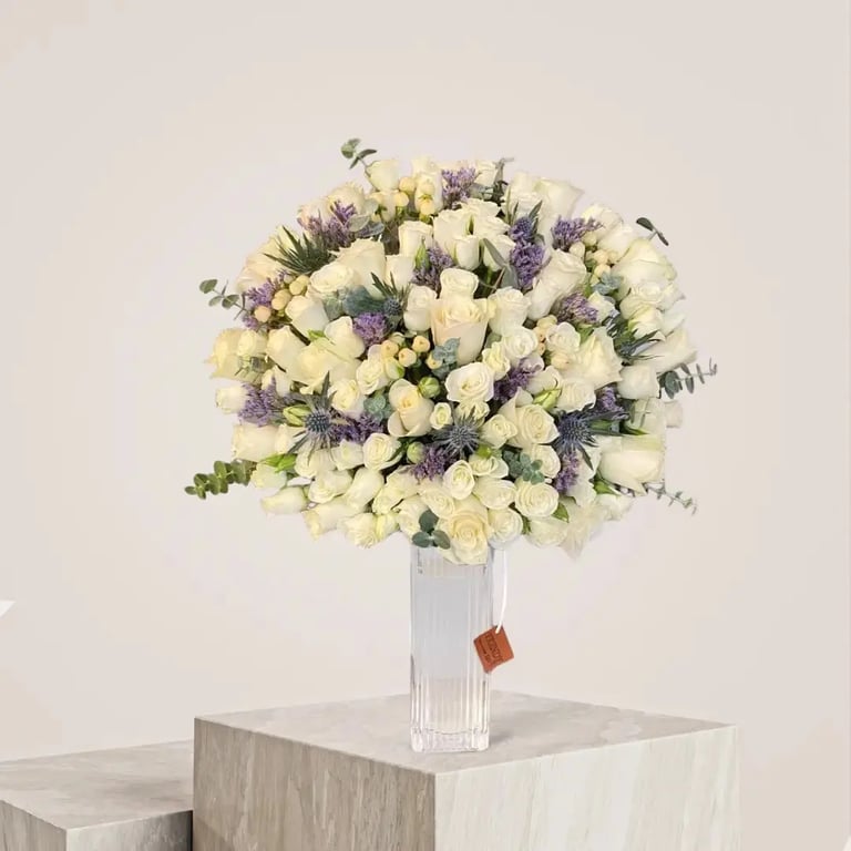 تتميز هذه الفازة الفاخرة بتشكيلة رائعة من الروز والبيبي روز والكليبتوس واللافندر الهولندي الطبيعي.
