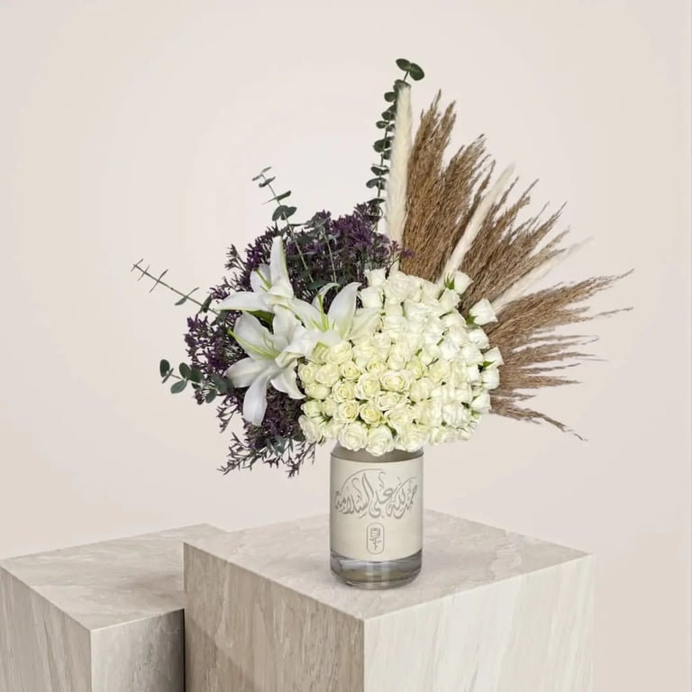 أضف لمسة من الأناقة والجمال الطبيعي إلى منزلك مع فازة ورد البيبي روز مع السنابل و اللافندر الهولندي من متجر الزهرة العصرية !