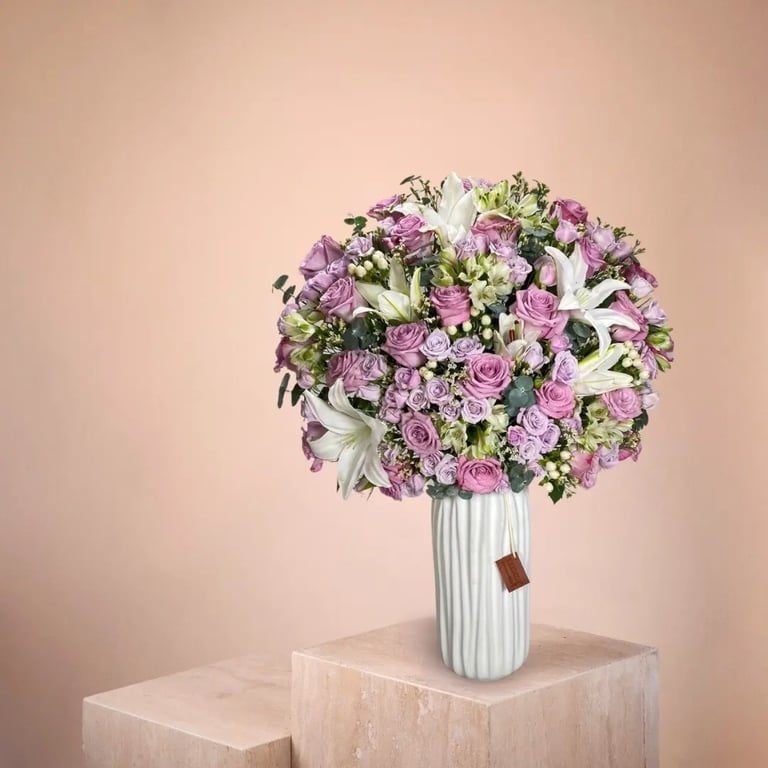 فازة ورد طبيعي فاخرة من ترندي روز تجمع بين الأناقة والفخامة بتشكيلة مميزة من البيبي جوري الهولندي، مع لمسة فريدة من الاكسسوارات الهولندية الطبيعية.