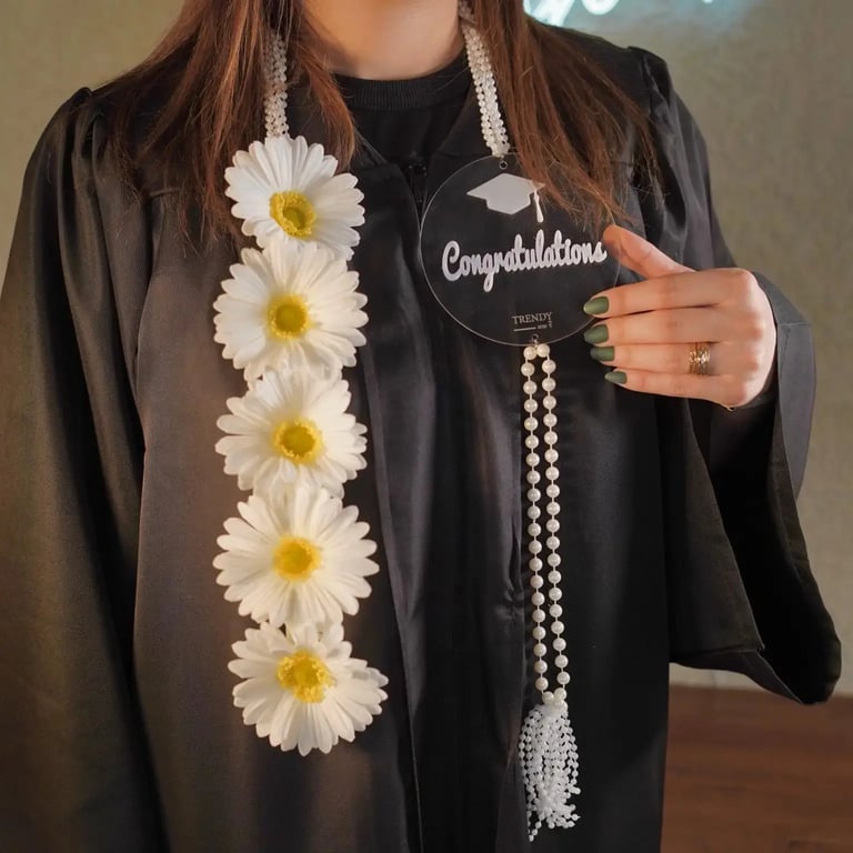يتميز بتصميم عصري يجمع بين جمال الزهور البيضاء وخرز أبيض أنيق، ليخلق إكسسوارًا فريدًا يبرز فرحة التخرج.