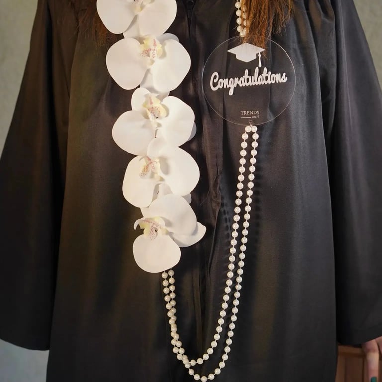 يتكون العقد من سلسلة من زهور الأوركيد الصناعية البيضاء الكبيرة، تتدلى بشكل عمودي على روب التخرج الداكن. يرافقه ميدالية دائرية شفافة تحمل كلمة "Congratulations" بخط انسيابي ورسمة قبعة تخرج بسيطة، متصلة بسلسلتين متوازيتين من الخرز الأبيض الذي يشبه اللؤلؤ وينتهي بشرابة أنيقة.