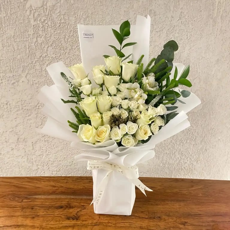 استمتع بلحظات الجمال والأناقة مع باقة ورد اوف وايت روز الفاخرة.