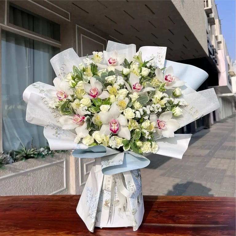 التغليف الفاخر: تأتي الباقة بتغليف ترندي روز المزدوج باللونين الأبيض والسماوي الهادئ، مع ربطة شريط فاخرة تحمل شعار ترندي روز.