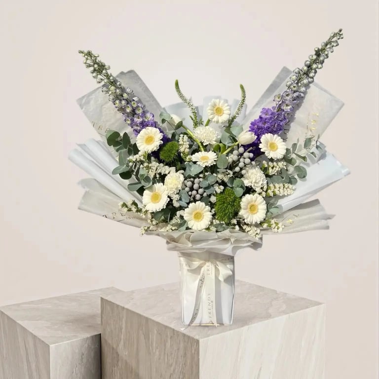 باقة ورد طبيعي فاخرة بتنسيق أنيق تحتوي على الدولفينيوم والجريبيرا والاكسسوارات الهولنديه