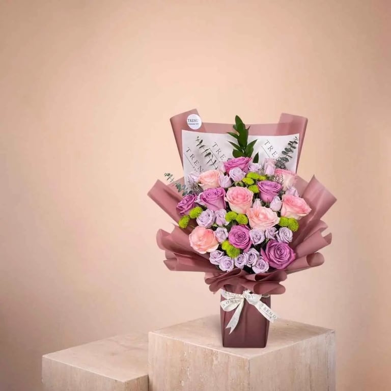 تنسيق أنيق: يتم لف الورد وتنسيقه بأسلوب ترندي روز المميز، باستخدام أغلفة وإكسسوارات راقية وشريط ساتان فاخر يحمل شعارنا.