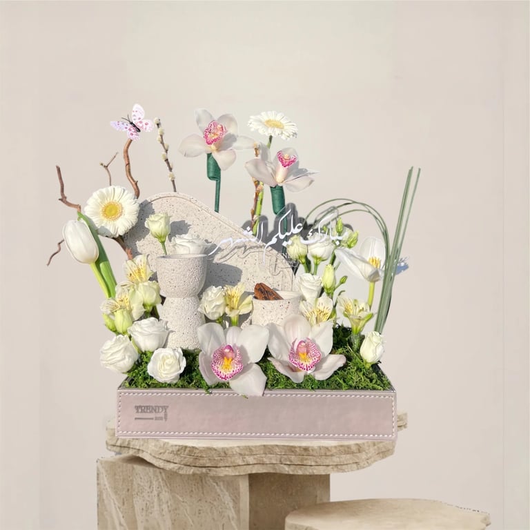 يجمع هذا التنسيق المبتكر بين ندرة زهور السيمبيديوم وإشراقة الجريبيرا، مع لمسة تراثية راقية تتمثل في طقم المبخرة الذهبي،