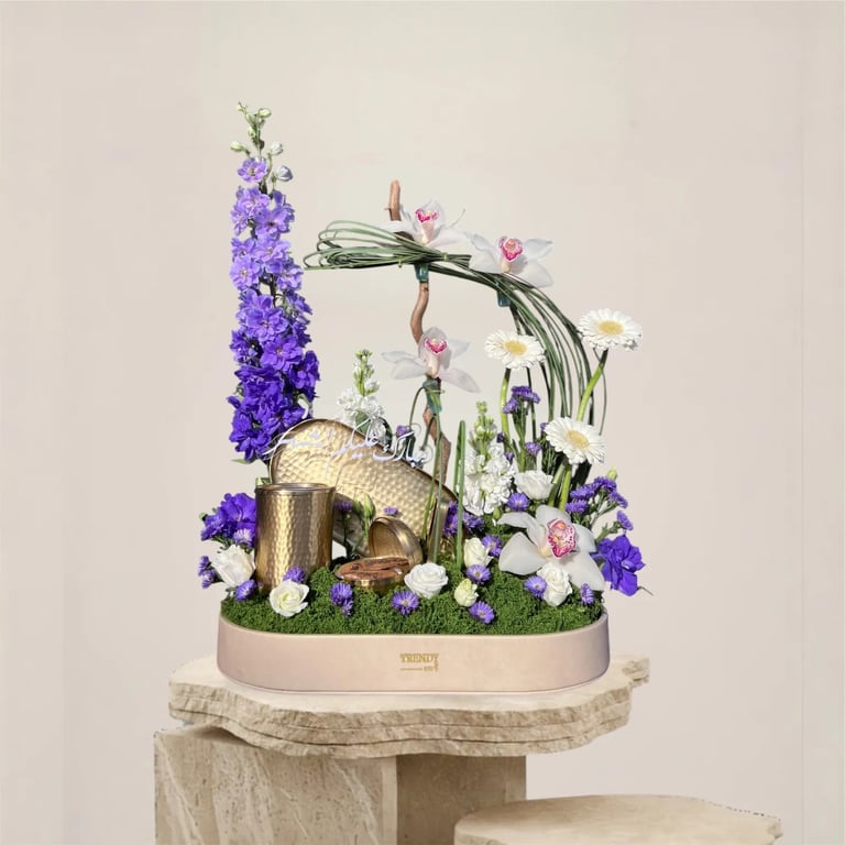بوكس ورد طبيعي مبتكر من الجريبيرا والدولفينيوم والاكسسوارات الهولنديه مع طقم مبخرة فاخر وعود مروكي ملكي
