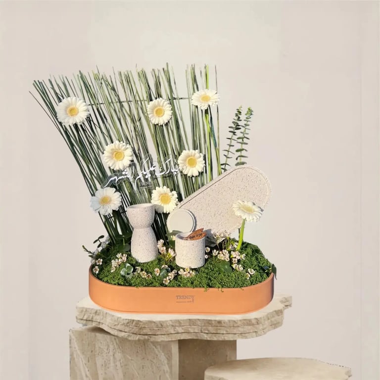 بوكس ورد طبيعي راقي بتشكيلة من الجريبيرا والاكسسوارات مع طقم مبخرة مميز وكسر عود مروكي