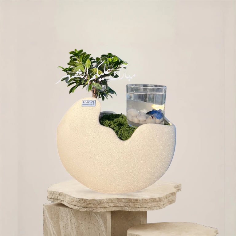 يجمع هذا التنسيق الفريد بين خضرة نبات البونساي العريق وحيوية السمك الطبيعي، ليخلق توازناً بيئياً مصغراً يبعث على الراحة والهدوء في أي مساحة يوضع فيها.