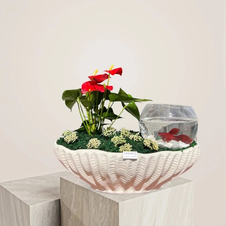 تتميز هذه فازة نبات طبيعي بتناغم بصري فريد يجمع بين نبتة الأنتوريوم الطبيعية، المشهورة بأزهارها الجذابة ذات الألوان المشرقة، وفازة زجاجية مدمجة بداخلها سمكة زينة (السمك الطبيعي)،