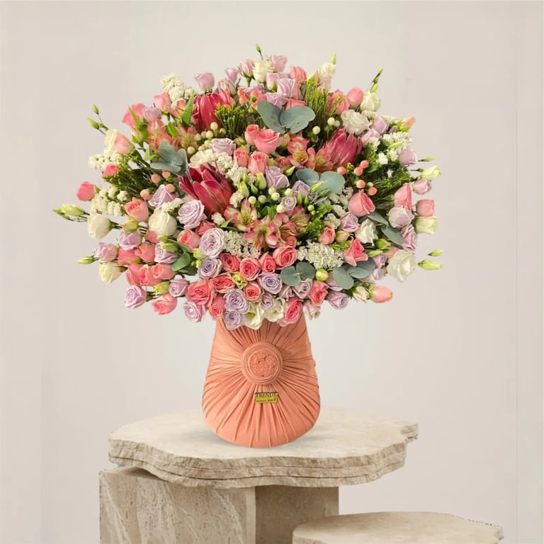فازة ورد البيبي جوري الطبيعي بتغليف قماشي فاخر