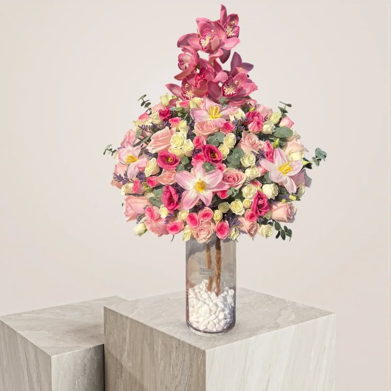 يأخذك الجوري بجماله إلى عالم من الروعة داخل الفازة الفاخرة، مصحوبًا بالاكسسوارات الهولندية الفاخرة .