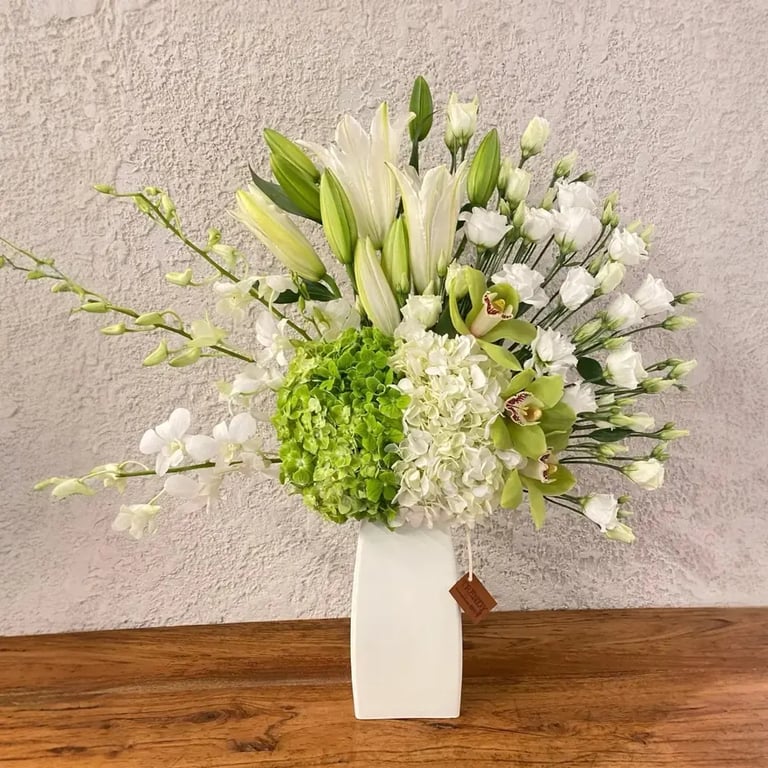 استمتع بلحظات سحرية مع فازة ورد الهيدرنجا والكازابلانكا الطبيعي مع الاكسسوارات لتكمل جمالها.