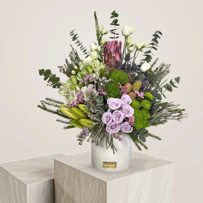 فازة ورد بروتيا فلاور بتشكيله من البيبي روز والكازبلانكا والبروتيا هي قطعة فنية أنيقة وراقية تضيف لمسة من الجمال والأناقة إلى أي منزل أو مكتب