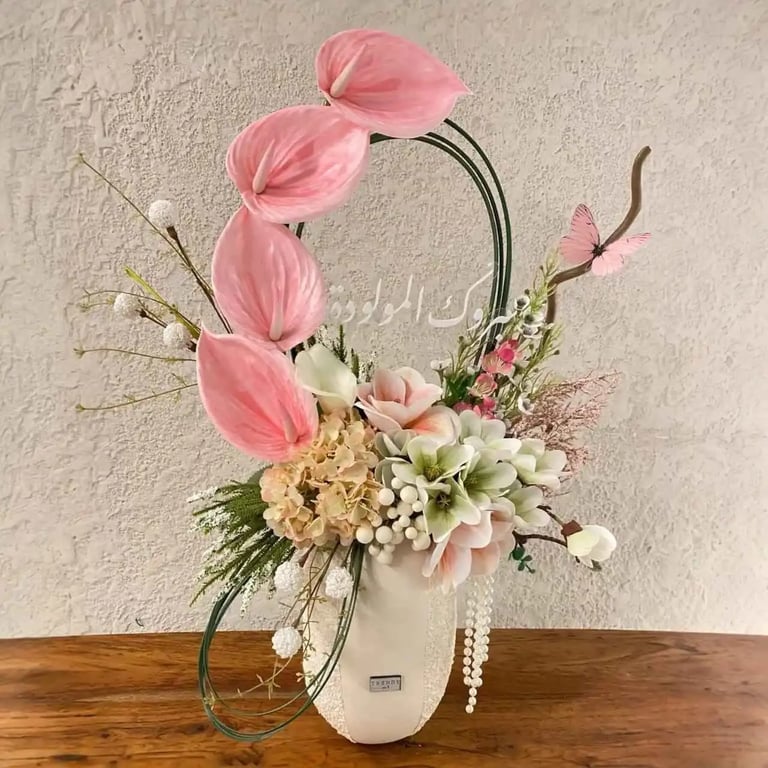 التنسيق: تشكيلة من الورود الصناعية ذات الجودة العالية بملمس طبيعي وألوان هادئة تناسب استقبال المواليد .