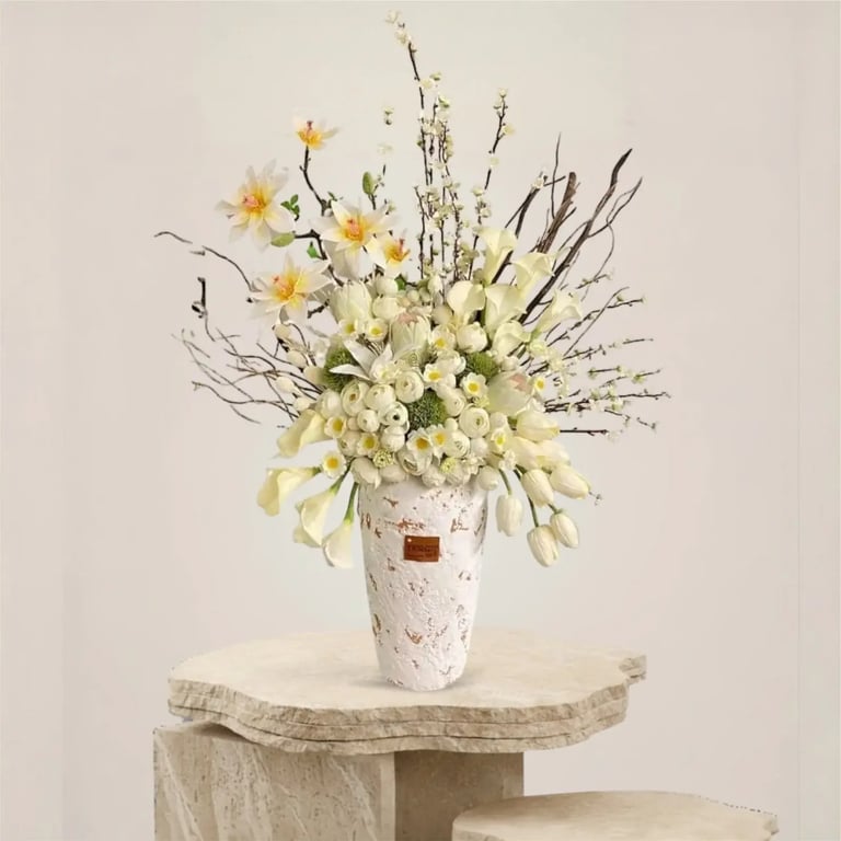 مزينة بتشكيلة فاخرة من الزهور الصناعية التي تبدو حقيقية و طبيعية بشكل مذهل.