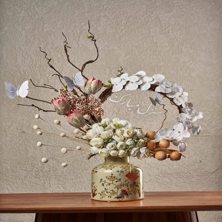 - عيد ميلاد: أضف لمسة مميزة من البهجة والاحتفال مع تشكيلة من الزهور الصناعية و المجففات مع فازة فاخرة.