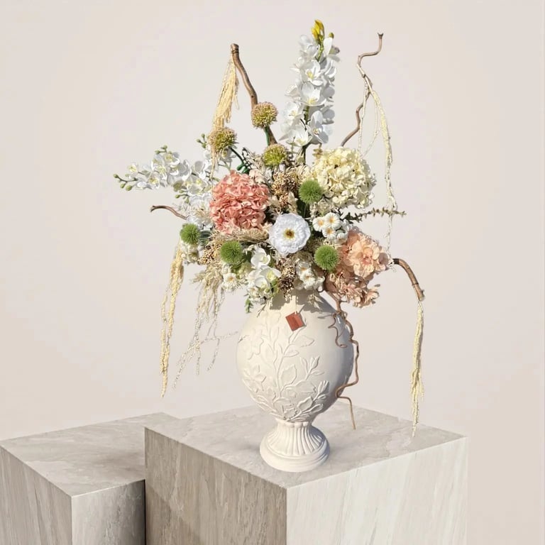 التنسيق المبتكر: يجمع التصميم بين أنواع مختلفة من الزهور الكبيرة، الأغصان الفنية، والإكسسوارات الأنيقة التي تمنح الفازة طابعاً عصرياً وفخماً.