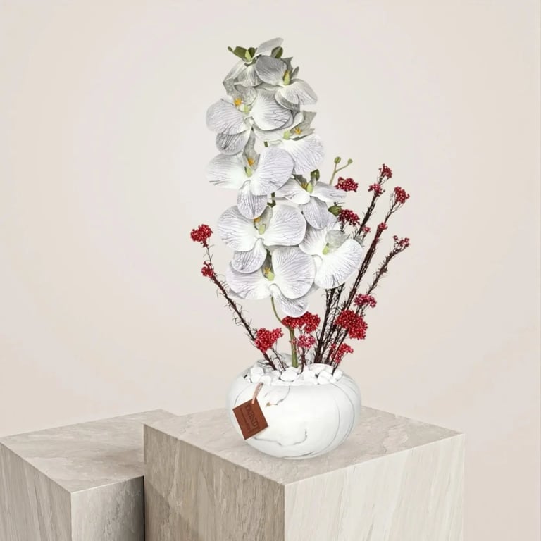 إن اقتناء فازة ورد صناعي من الأوركيد الأبيض يُعد استثماراً جمالياً يضفي فخامة فورية على المكان،