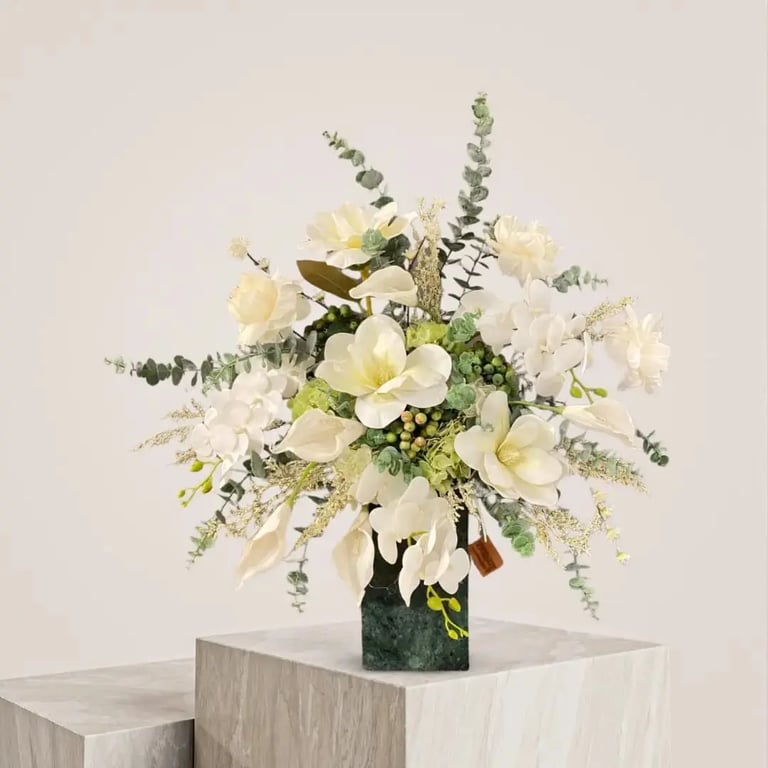 تتميز هذه الفازة بقاعدة أنيقة مصنوعة من الرخام عالي الجودة بتفصيل عصري وفريد يعكس ذوق ترندي روز المميز. تحتضن الفازة تشكيلة من الزهور الصناعية الفاخرة بألوان الأبيض النقي والأخضر الطبيعي،