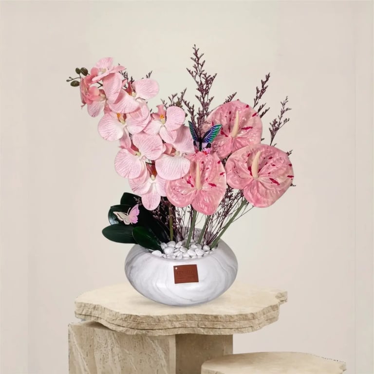 الأوركيد والأنتوريوم: تم اختيار الزهور الصناعية بملمس طبيعي (Real Touch) وألوان هادئة تمنحك إحساس الطبيعة الحية.