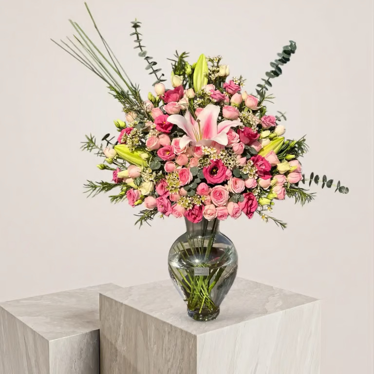 تجمع هذه الفازة بين جمال الطبيعة وتنسيق راقٍ منسق بلمسة عصرية، لتكون هدية مثالية تعبر عن الذوق الرفيع. يتميز التصميم بـ التنسيق الكثيف الذي يضم درجات متدرجة من اللون الوردي ، من البيبي روز الناعم إلى الورد الجوري الأنيق. يضمن هذا التنسيق مظهراً فاخراً وجذاباً يدوم طويلاً.