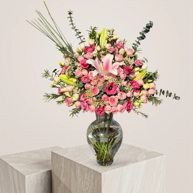 مصمم خصيصاً للتعبير عن الحب والمشاعر الصادقة بكثافة لا مثيل لها. تجمع هذه الفازة بين جمال الطبيعة وتنسيق راقٍ منسق بلمسة عصرية، لتكون هدية مثالية تعبر عن الذوق الرفيع.