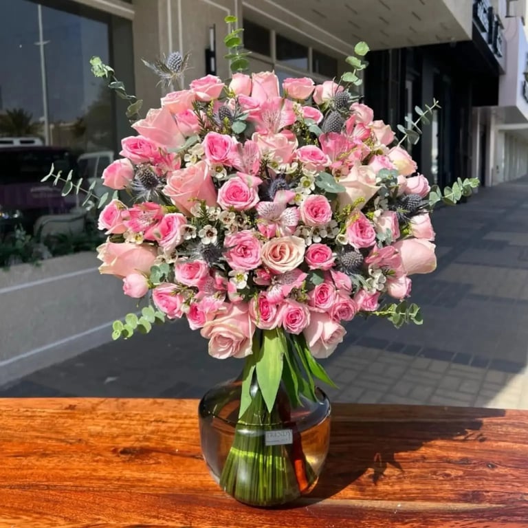أضف لمسة من الرقة والبهجة إلى منزلك أو مكتبك مع فازة ورد طبيعي أنيقة من تنسيق خبراء ترندي روز. يجمع هذا التصميم بين كلاسيكية الورد وعصرية التنسيق الهولندي المبتكر ليكون القطعة المركزية المثالية في أي مساحة.