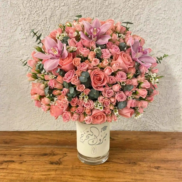 فازة زجاجية أنيقة تحتضن تشكيلة ساحرة من أجود أنواع الروز الطبيعي بألوان تنبض بالحياة، لتضفي لمسة من الجمال والرقي على هذه المناسبة المميزة.