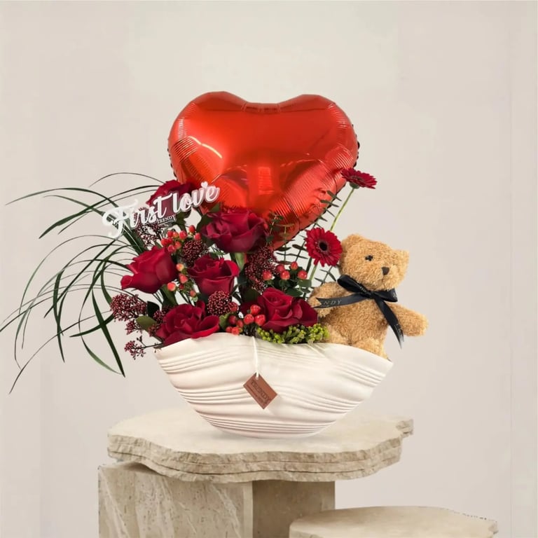 دمية التيدي بير (Teddy Bear): دب صغير محشو بالفرو الناعم بلون بني دافئ، يمسك بقلب أحمر صغير، ليكون رفيقاً لطيفاً يكمل جمال الزهور.