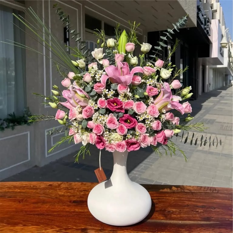تميز بإهداء يليق بالأناقة والرقي مع فازة الورد الطبيعي الفاخرة بتنسيق رائع يضم البيبي روز بتكامل مع الأكسسوارات الهولندية الراقية. هذا التنسيق هو قمة الجمال الكلاسيكي والرومانسية المترفة، مصمم ليكون حديث المجالس وعنوان الذوق الرفيع.