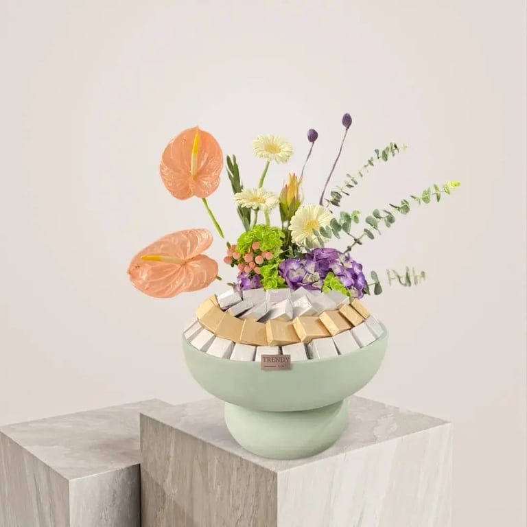 فازة ورد طبيعي أنيقه من تفصيل ترندي روز تحتوي على شوكلت ترندي روز السويسري