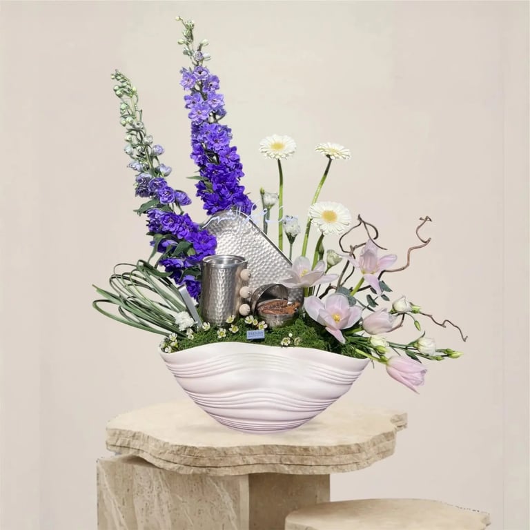 فازة ورد طبيعي فاخرة بتشكيلة من الدولفينيوم والجريبيرا والاكسسوارات الهولنديه بالاضافة الى طقم مبخرة فاخر