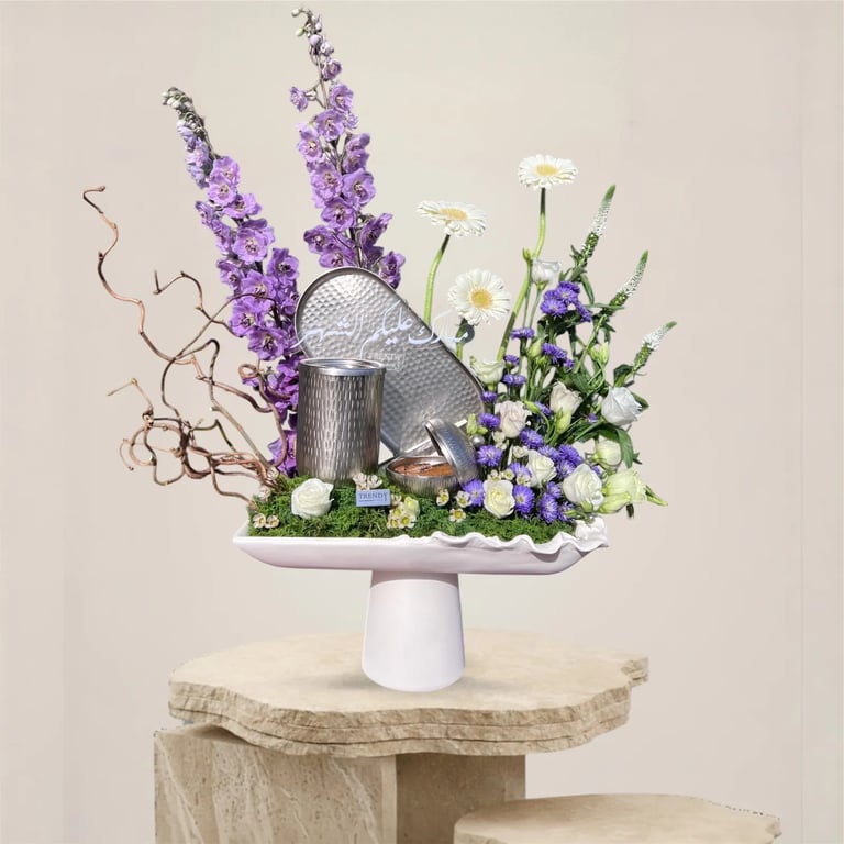 يجمع هذا التنسيق المبتكر بين فخامة زهور الدولفينيوم البنفسجية الممتدة نحو السماء ونقاء الجريبيرا البيضاء، ليخلق توازناً بصرياً مذهلاً يضفي لمسة من الوقار والجمال على مجلسك.