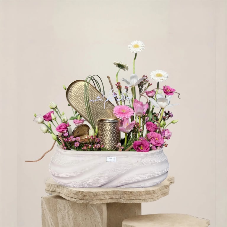 يجمع هذا التنسيق الحصري من ترندي روز بالرياض بين رقة زهور الجريبيرا وأناقة طقم المبخرة الذهبي، مما يجعلها قطعة ديكور مركزية تأسر الحواس وتجمل مائدتك في شهر رمضان المبارك.