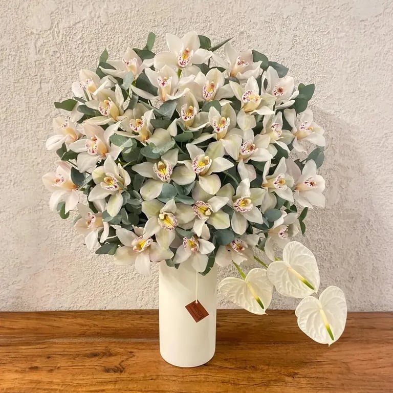 السيمبوديوم (Cymbidium): زهور الأوركيد الفاخرة ذات الجودة العالية، التي تضفي لمسة ملكية واستوائية على التنسيق.