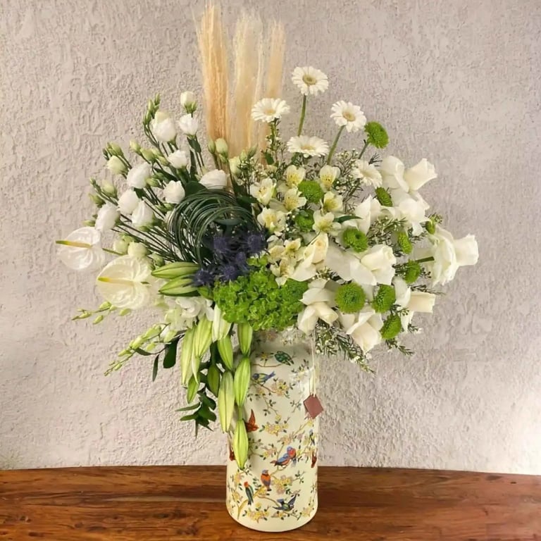 هذه الفازة هي تعبير عن الفخامة والاحتفال بجمال الطبيعة. تتميز هذه الفازة ورد طبيعي بتشكيلة غنية من أفخر الورود الهولندية الطبيعية، المنسقة بكثافة في فازة أنيقة.