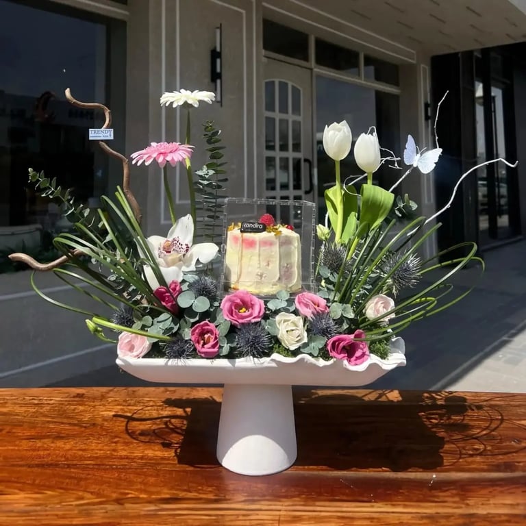 فازة ورد طبيعي مع كيك كانديرا... تصميم فني يجمع بين الجمال والمذاق الرفيع!