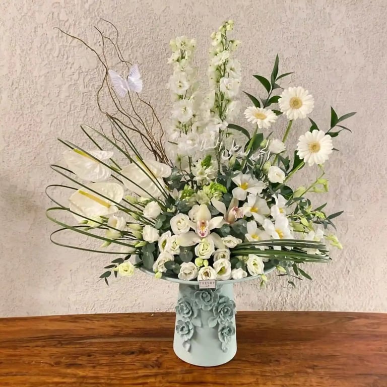 الورود: تشكيلة غنية من زهور الجريبيرا (الوردية والبيضاء) التي تضفي لمسة من البهجة، مع زهور الدولفينيوم (أو زهور سنابل أخرى بيضاء في الصورة) التي تمنح التنسيق ارتفاعاً ملفتاً.