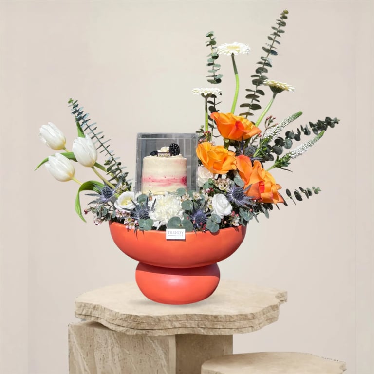 دلل حواسك أو فاجئ من تحب بهدية تجمع بين سحر الطبيعة وعذوبة المذاق مع فازة ورد طبيعي مع كيك من ابتكار ترندي روز بالرياض.