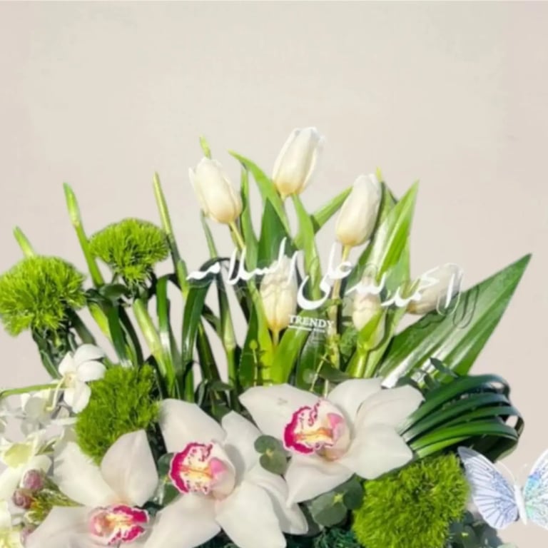 أناقة التوليب: أغصان التوليب البيضاء الشامخة التي تمنح التنسيق طابعاً كلاسيكياً لا يضاهى. الإكسسوارات الفاخرة: كرات "الجرين تريك" الخضراء المخملية مع أزهار الأوركيد الصغيرة المنسدلة، بالإضافة إلى فراشة فضية لامعة تضفي لمسة من الحيوية والبهجة.