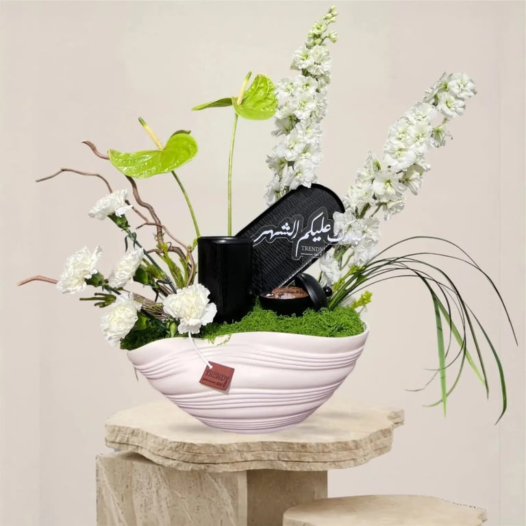 استقبل ضيوفك بأرقى أساليب الضيافة السعودية مع فازة ورد طبيعي وعود من تصميم ترندي روز