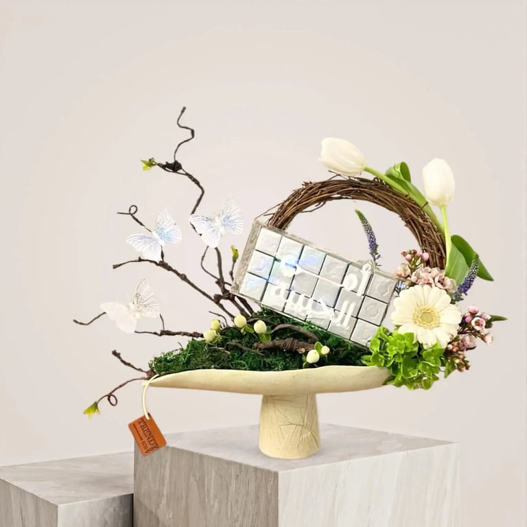فازة أنيقة بتصميم مبتكر يجمع بين جمال الزهور الطبيعية وسحر الفراشات، مع لمسة من الفخامة تتمثل في شوكولاتة ترندي روز السويسرية اللذيذة.