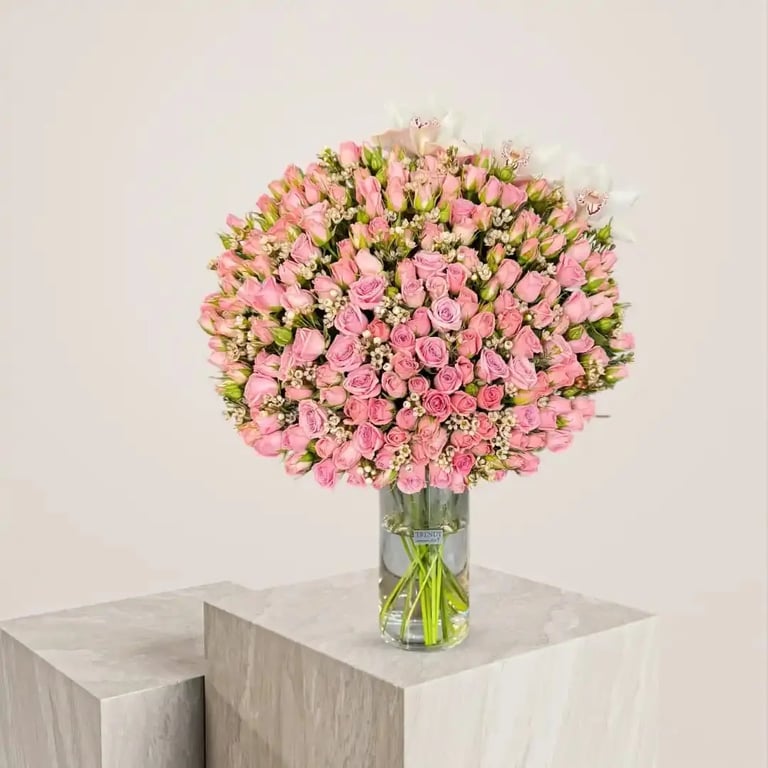تتألق الفازة بتشكيلة ساحرة من أجمل أنواع البيبي روز الطبيعي ، والتي تم اختيارها بعناية فائقة لضمان نضارتها وجمالها.