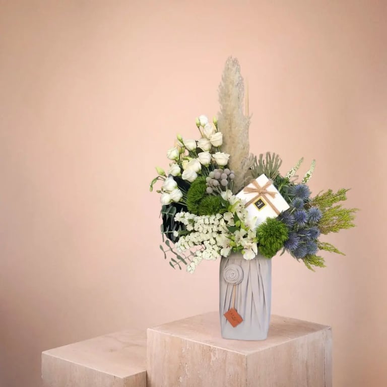هدية مميزة تُعبّر عن مشاعرك الراقية مع ورد طبيعي بقاعدة اسفنجية بتغليف قماشي فاخر مع شوكلاتة باتشي من متجر ترندي روز !